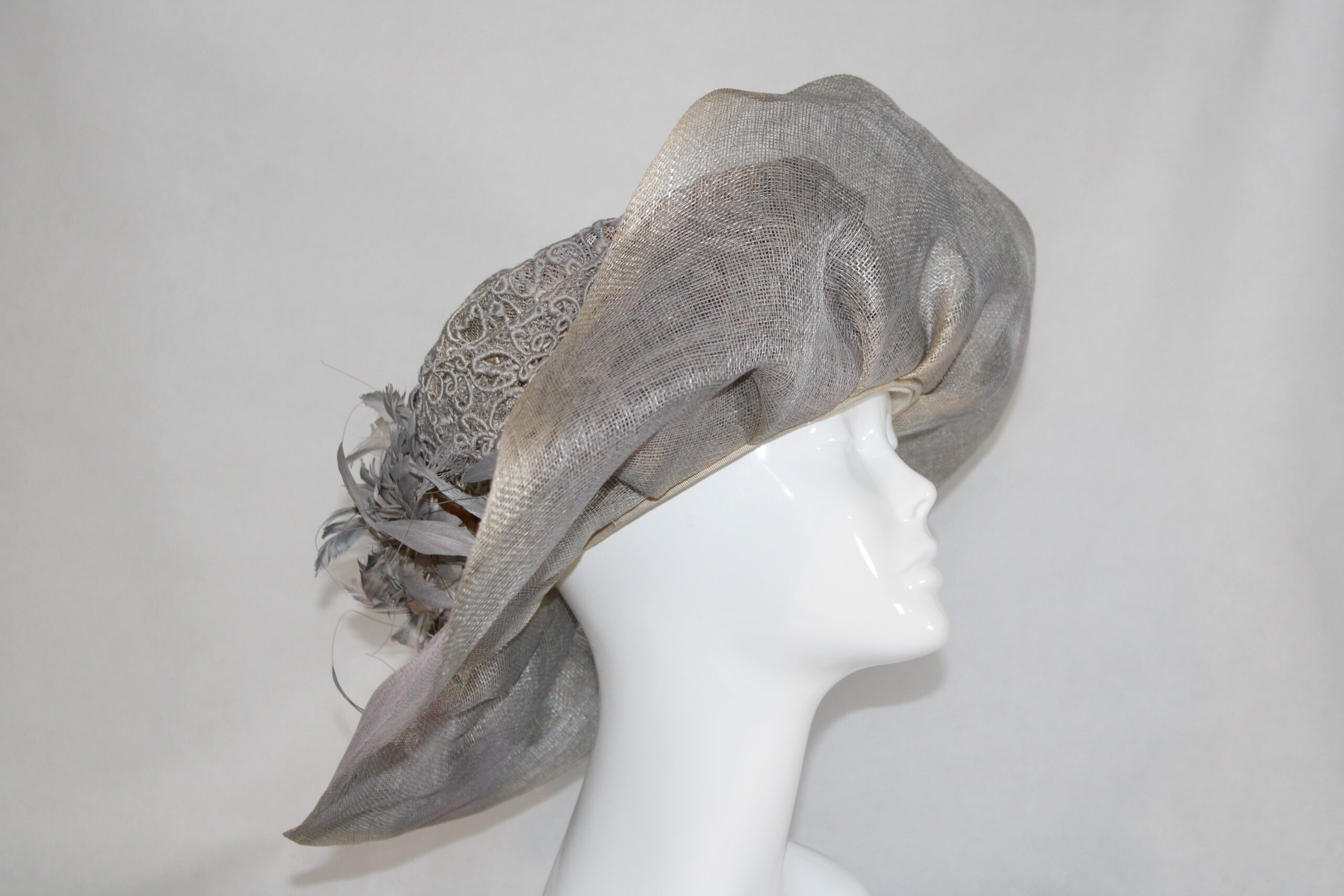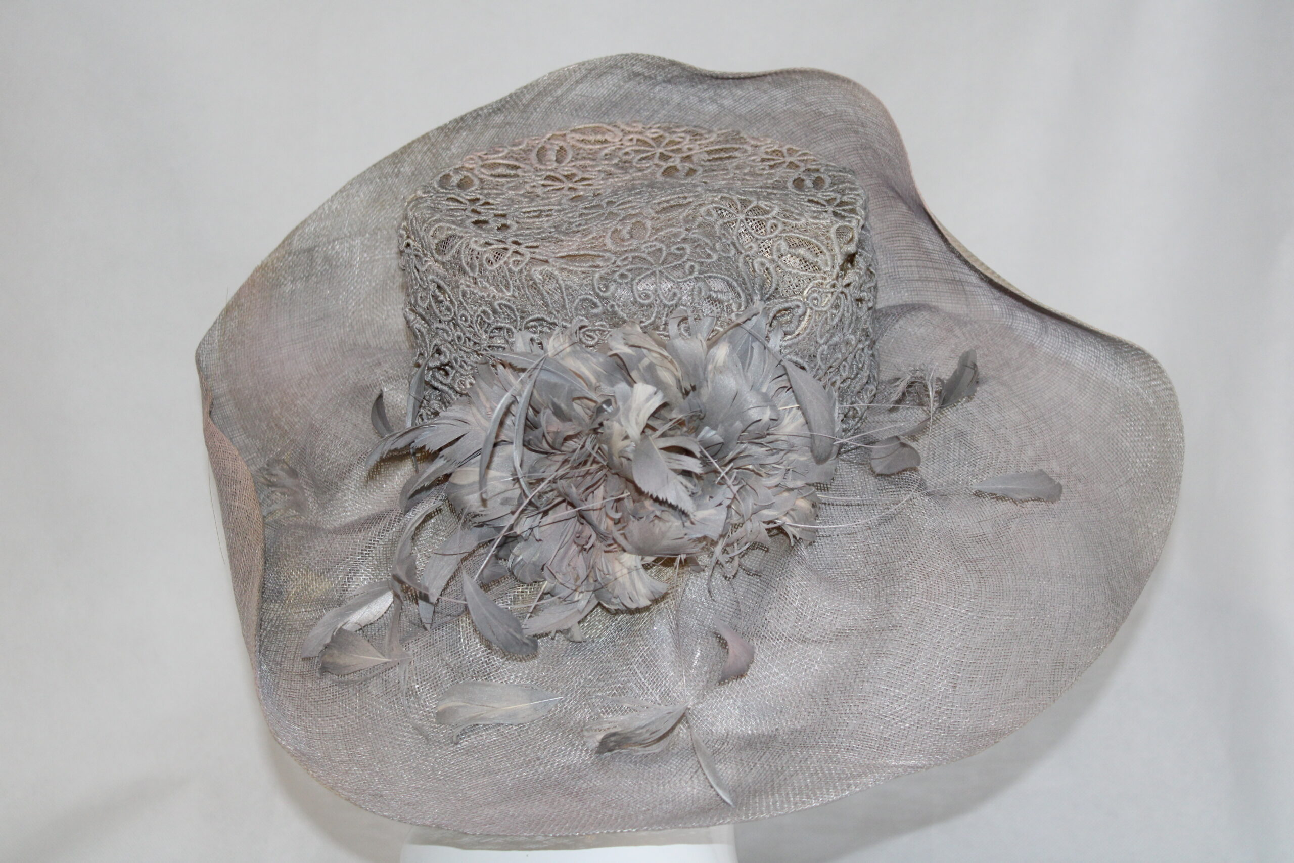 A magnificent fluid silver grey hat with upturned brim, delicate lace detail and feathers to the crown