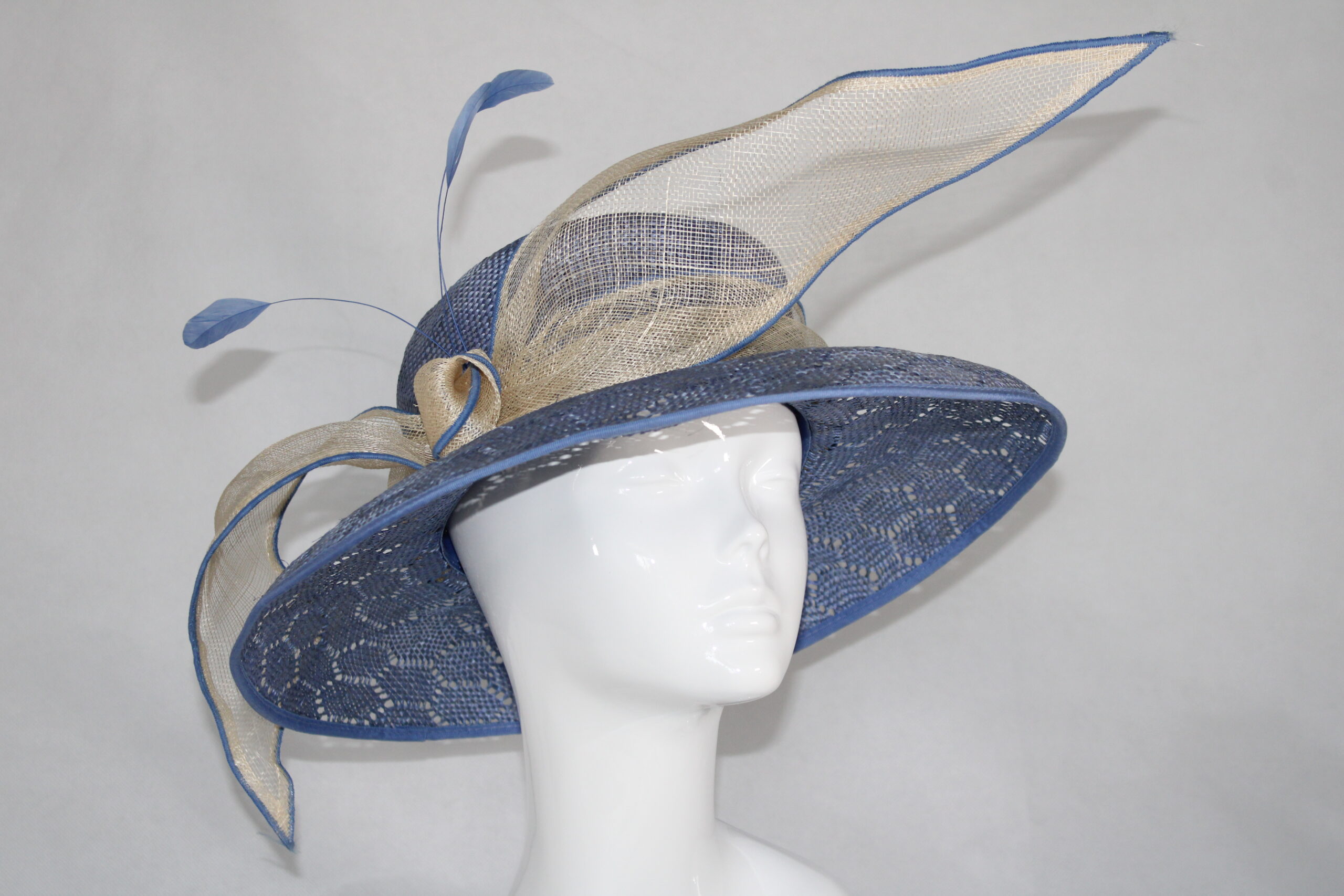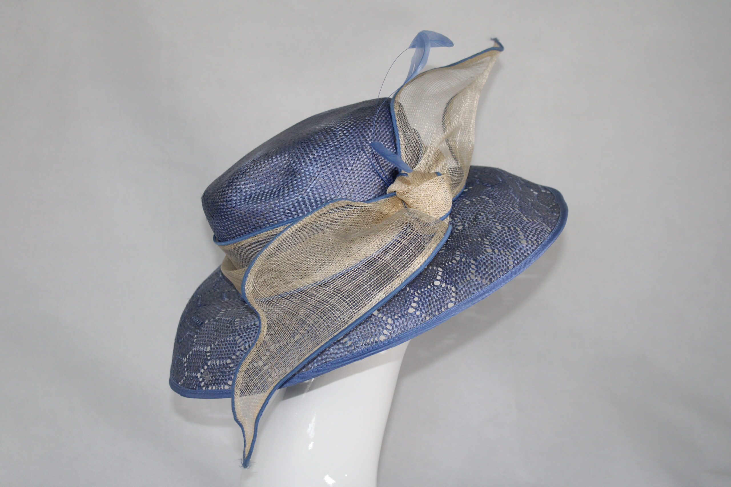 Blue and cream medium woven hat with cream band, large bow and tear drop feather detail