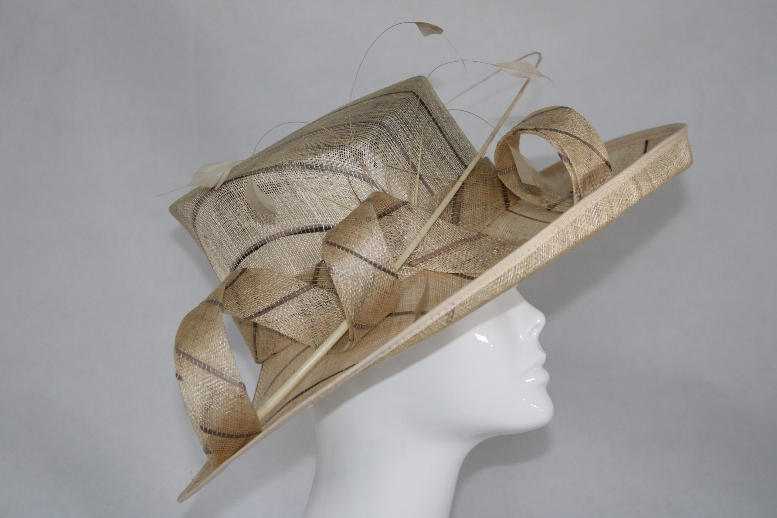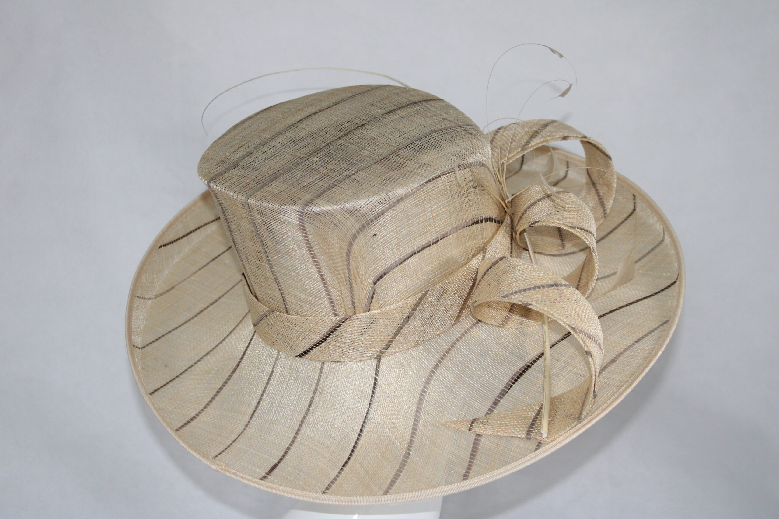 Medium gold hat with feint stripe detail, upturned brim and pleated loops with cream trim