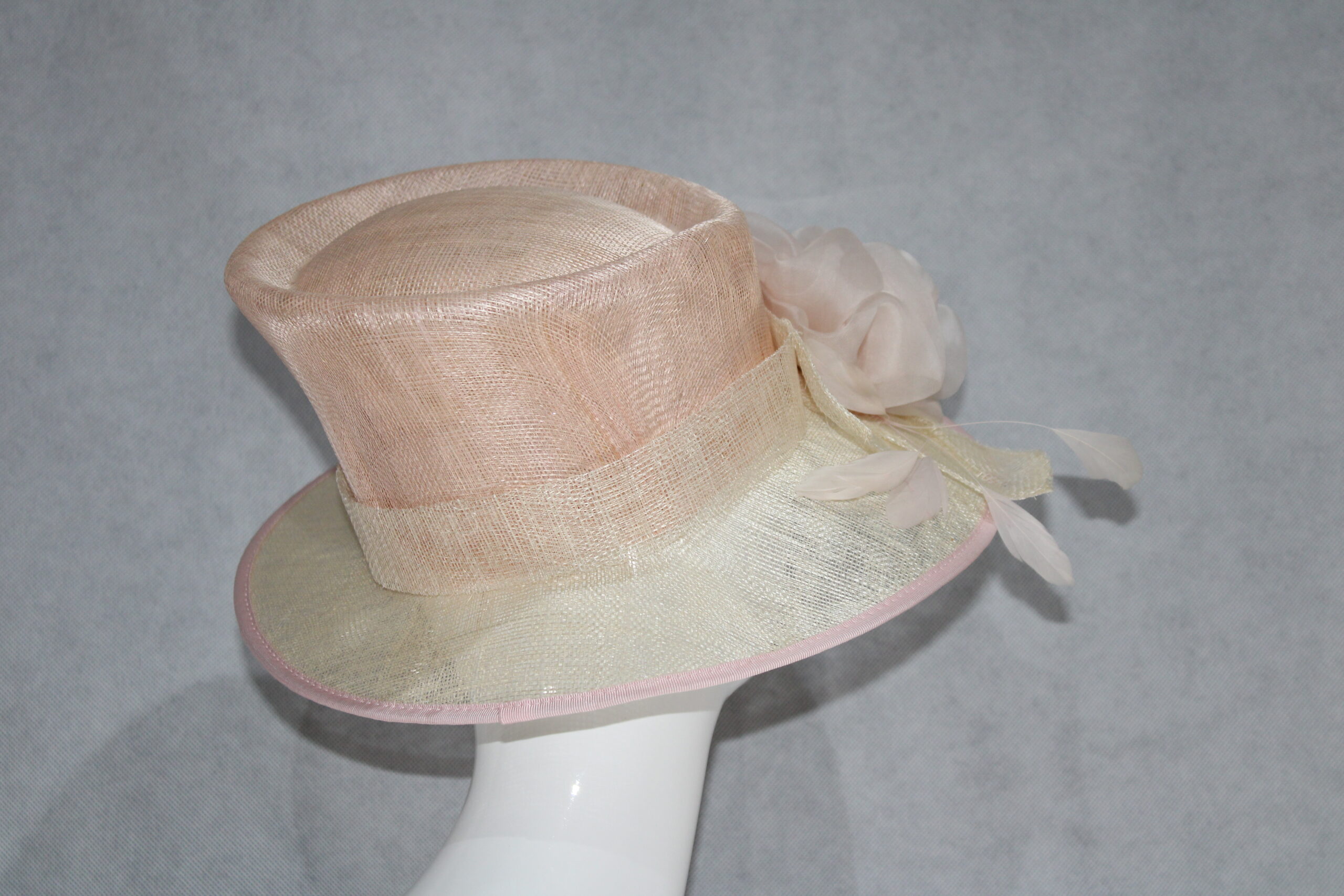 A small brim hat with a delicate pink crown and trim and a cream brim with cream rose detail
