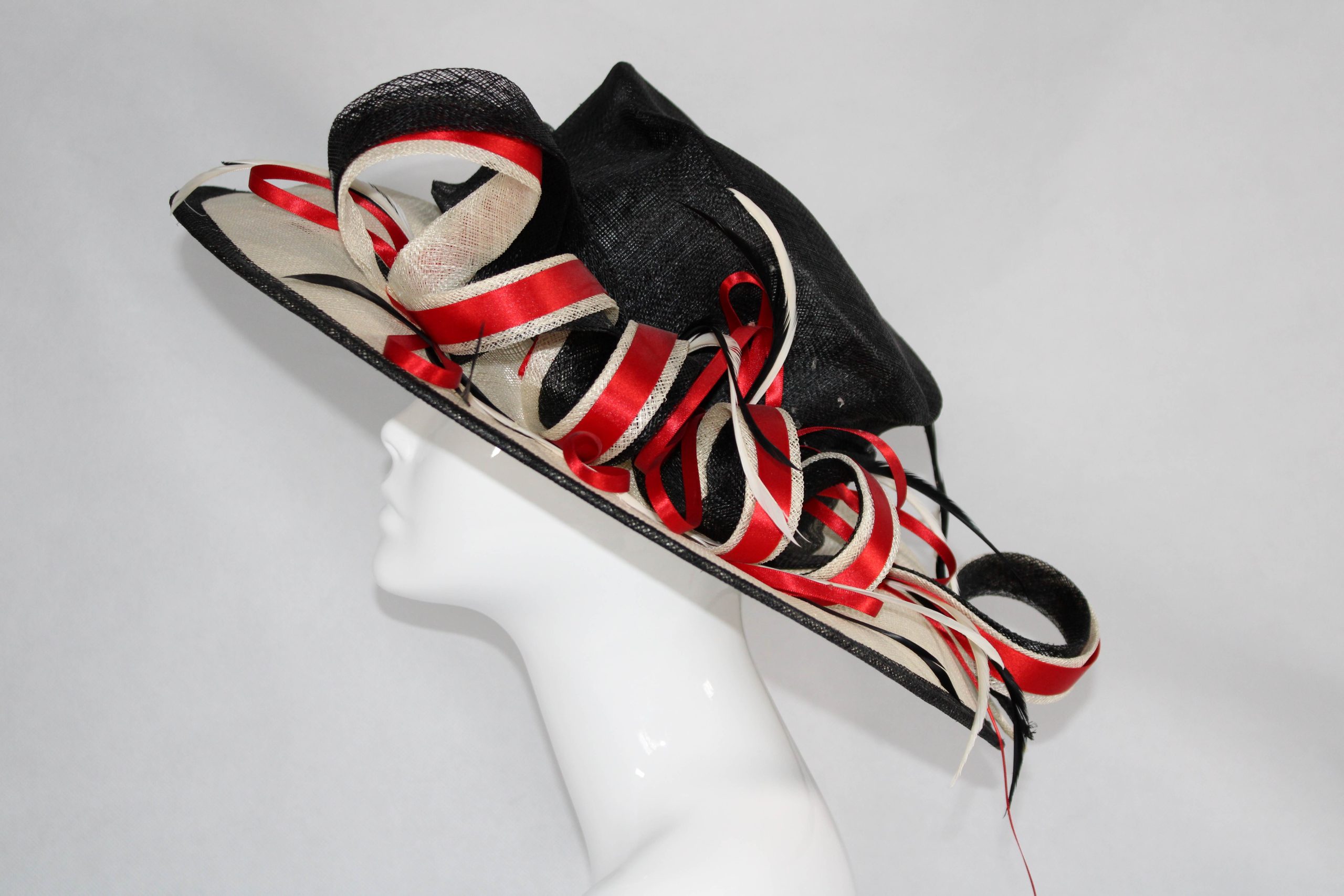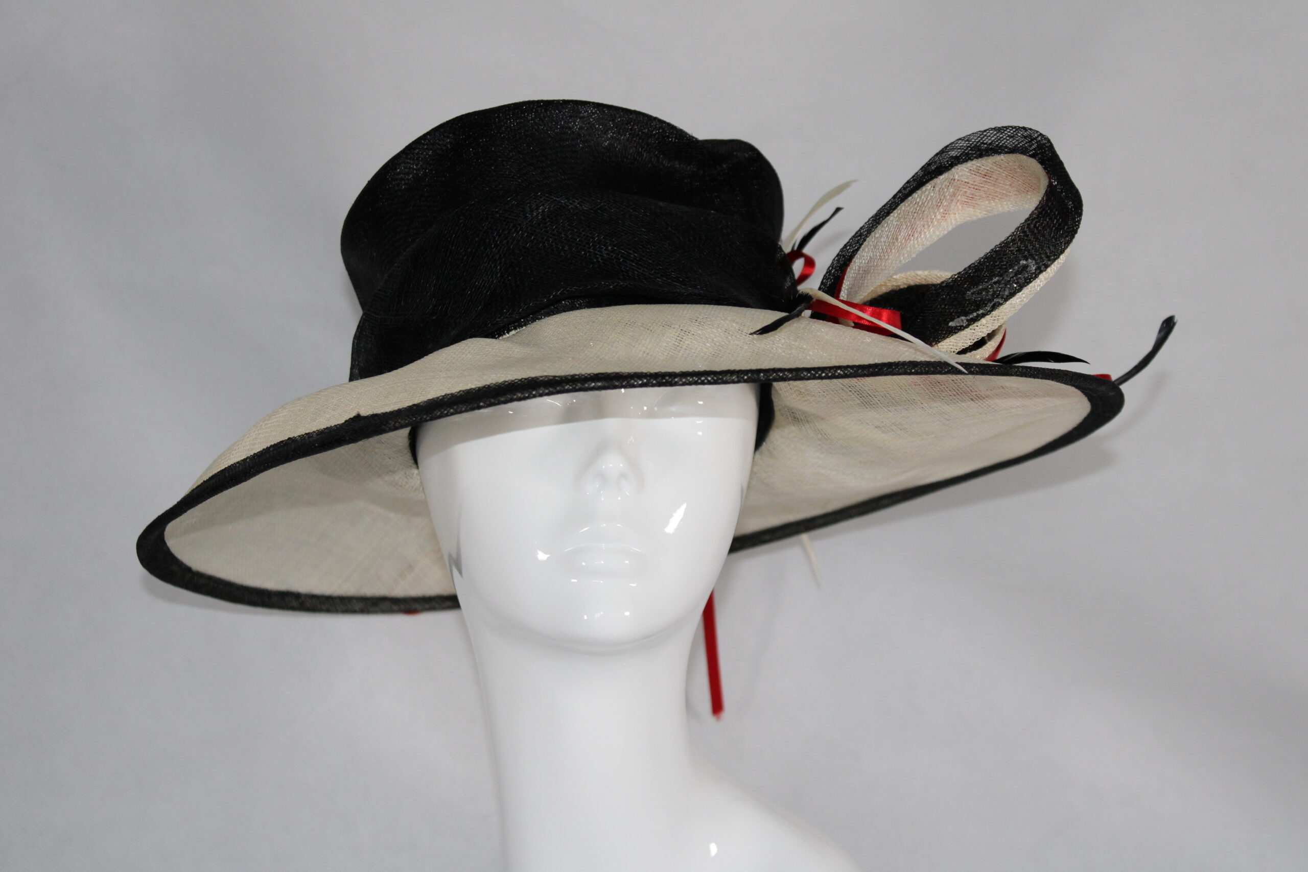 Black and cream large brim hat with petersham trim and black, red & cream twirls