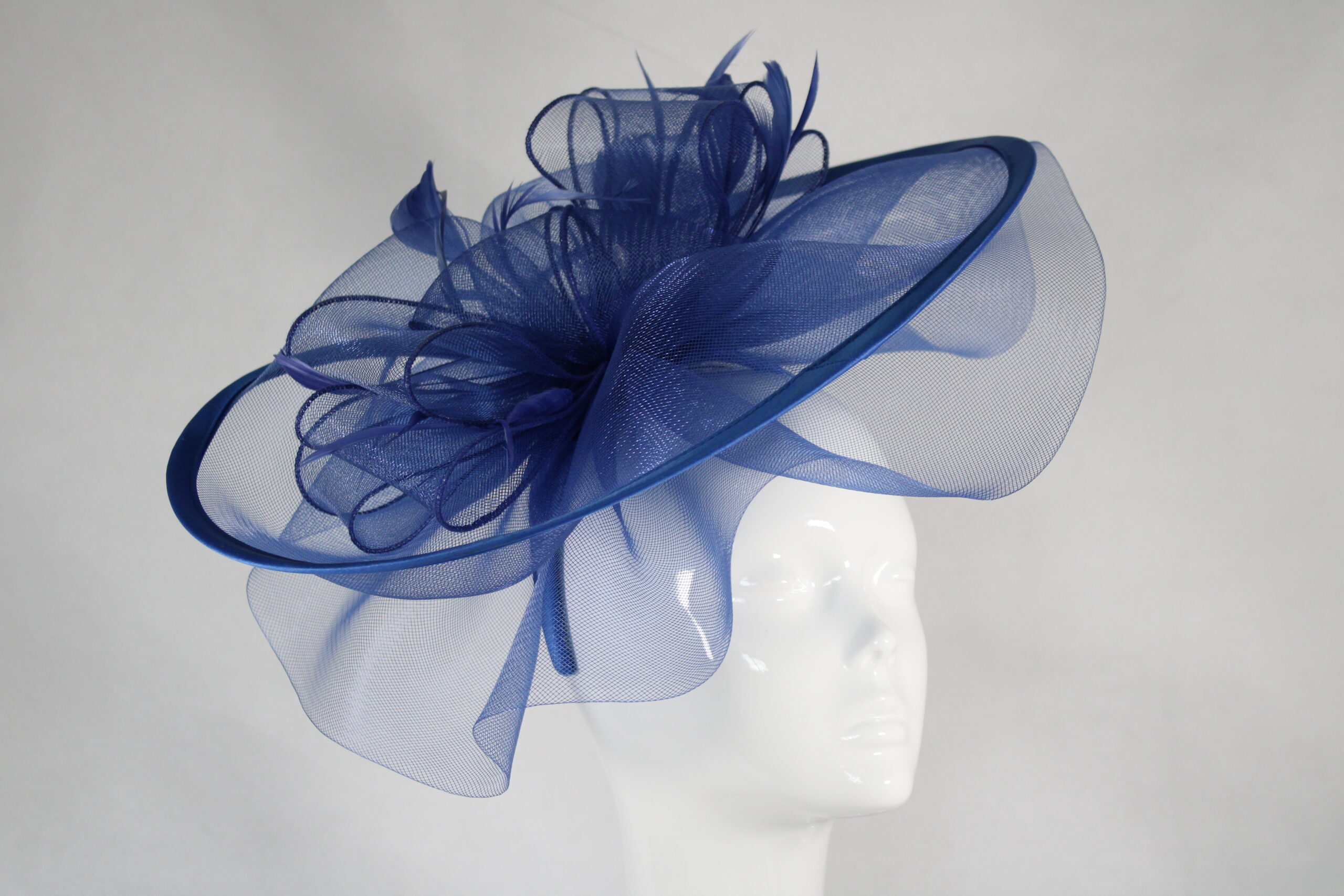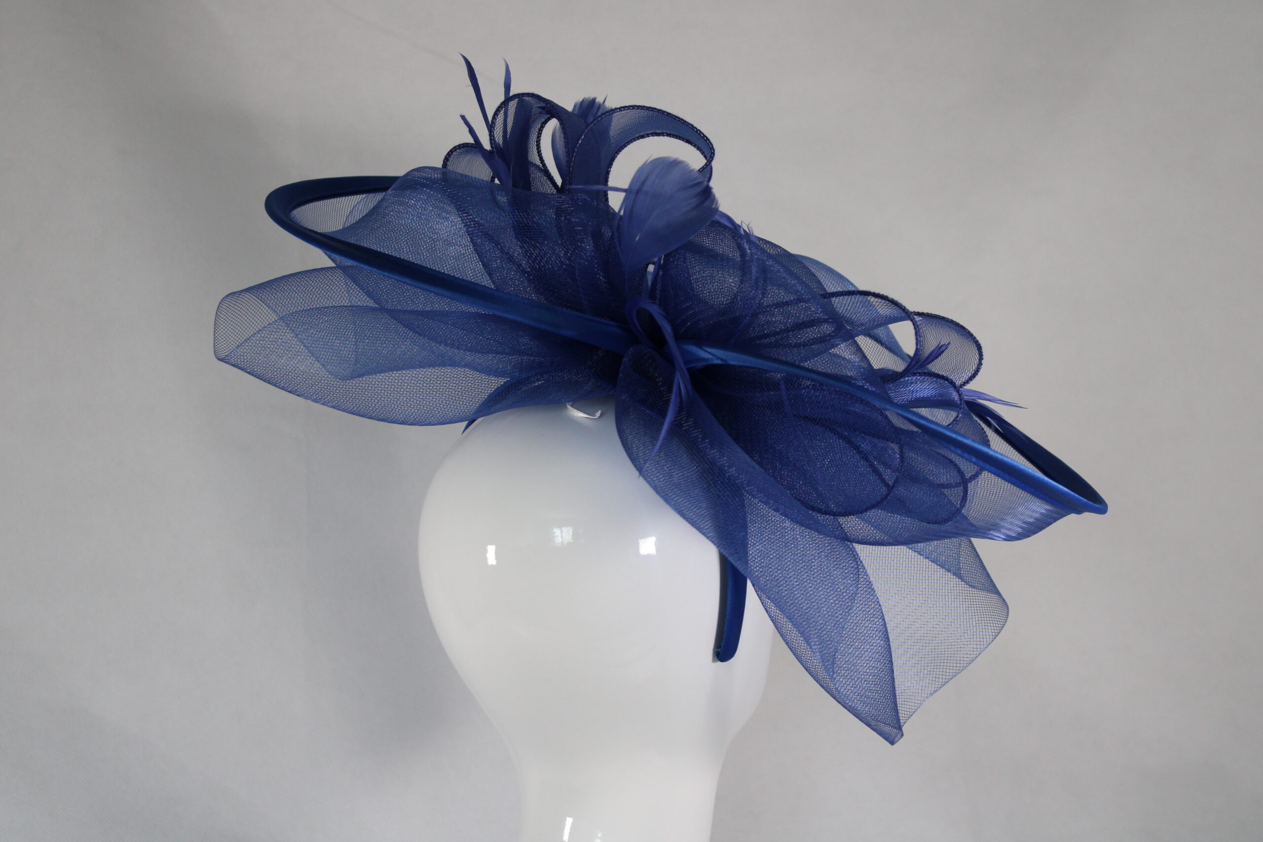 Electric blue large hatinator on a headband with chiffon detail