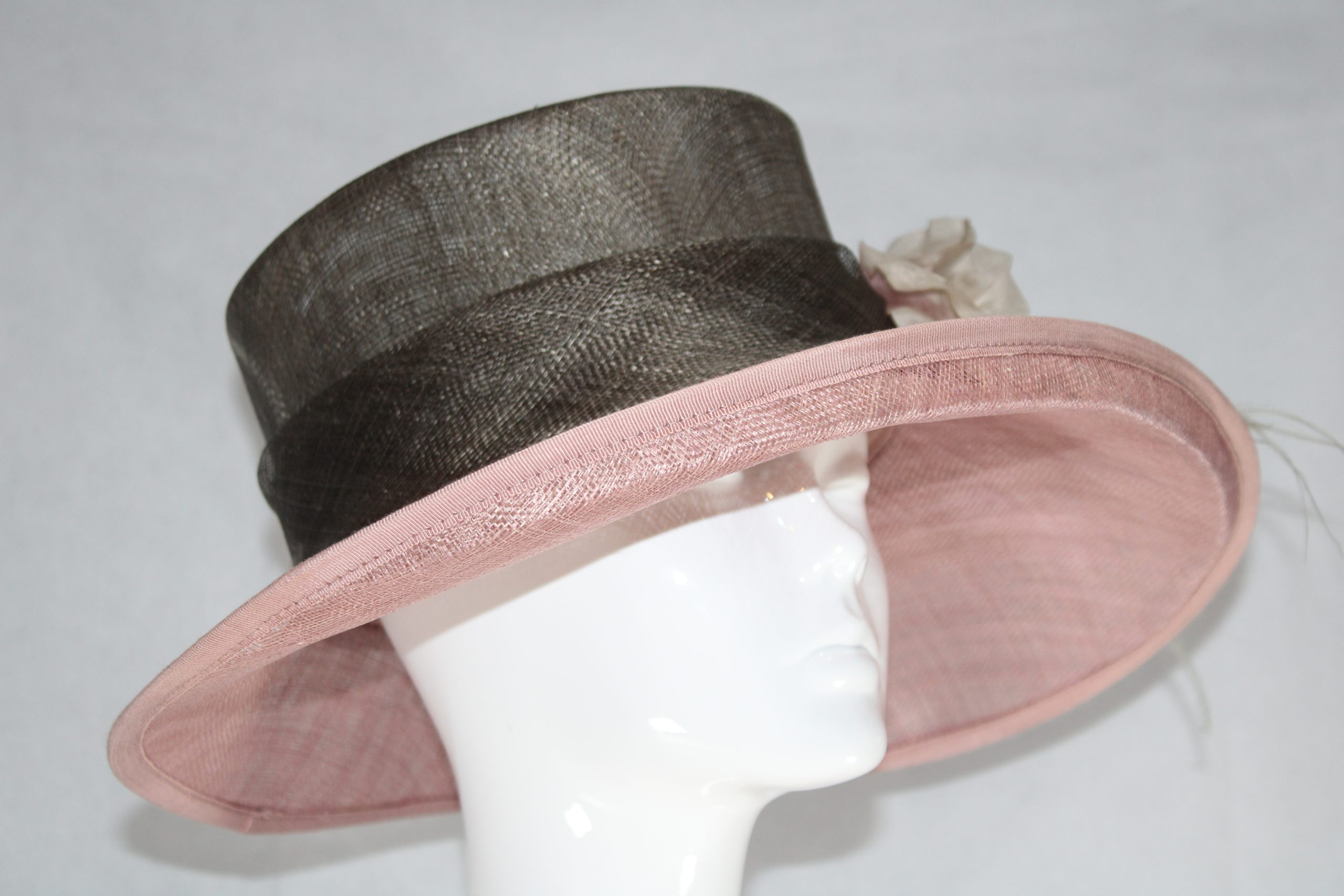 A pink and mink brown medium brim sinamay hat with delicate rose pink flowers and a smattering of fine feathers